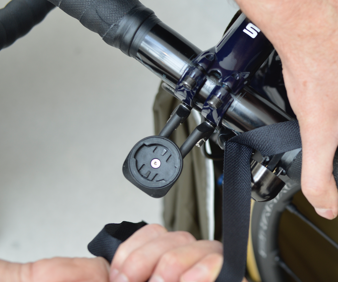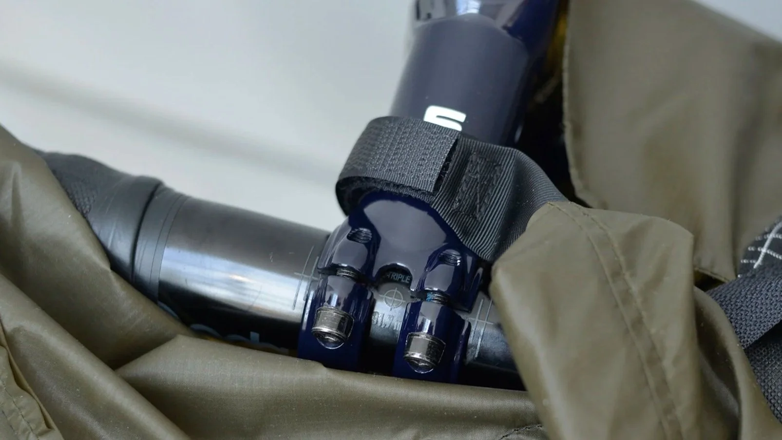 the integrated 38mm wide shoulder strap is secured to the bar stem with a triple tab velcro
